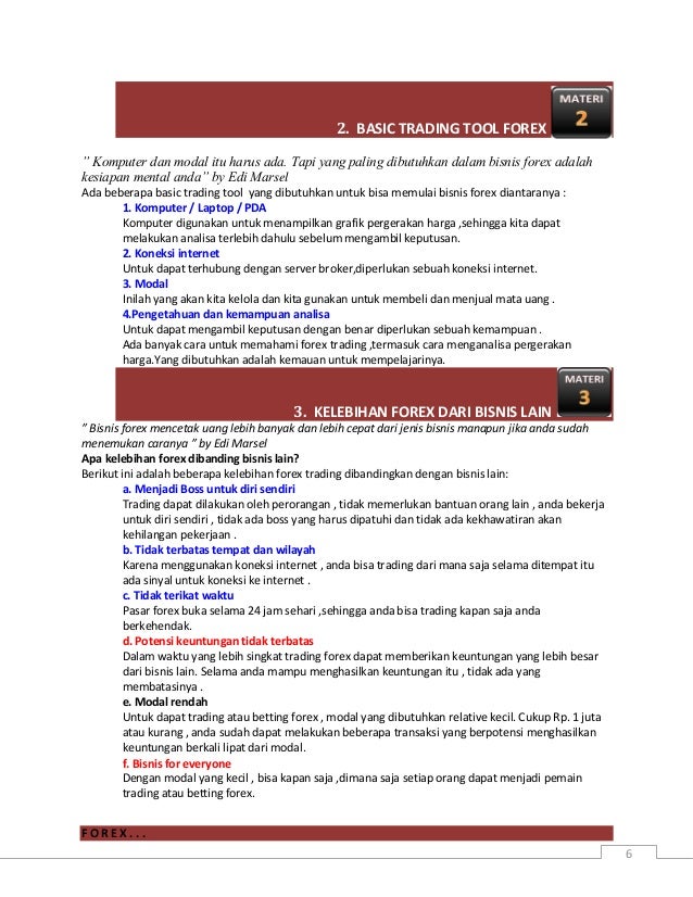 Bisnis forex memang memberikan peluang untuk mendapatkan hasil cepat, namun semua itu bisa diperoleh jika disertai dengan kemauan kuat serta tekun untuk terus belajar tentang trading forex. Saya ingin sekali belajar forex dari dulu kpingin belajar forex susah karna gk ada yg untuk belajar materi untuk pembalajaran. Belajar trading forex materi kelas pemula sampai strategi forex untuk trader dan broker forex.